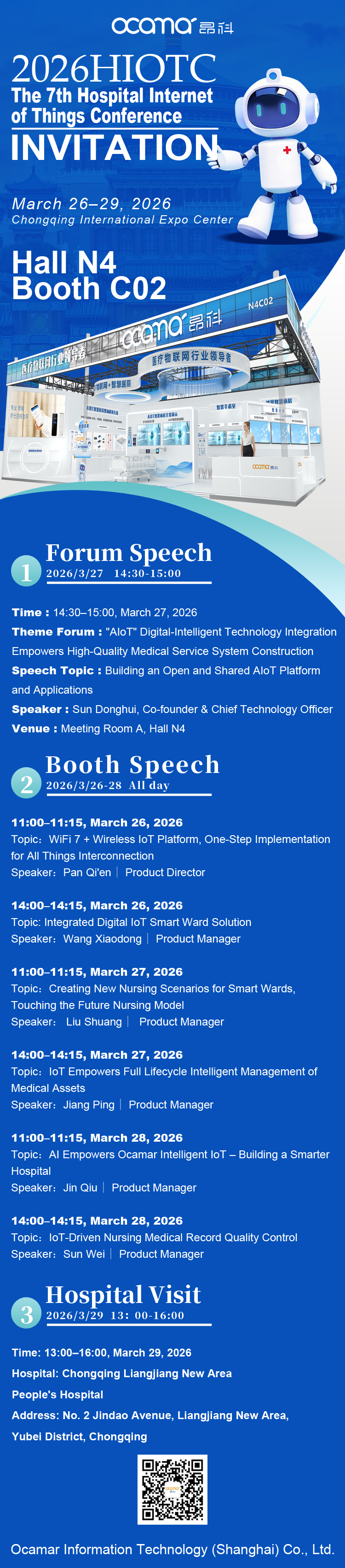 As AIoT technology is deeply integrated with medical scenarios, and the interconnection of all things empowers the high-quality development of hospitals, an annual grand event for the healthcare IoT industry is about to kick off. Ocamar sincerely invites you to attend the 7th HIOTC Hospital IoT Conference 2026, witness the innovative power of smart healthcare with us, and discuss the future of the industry together.